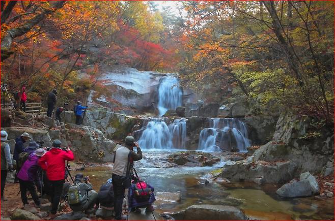 방태산의 단풍 중에서도 가장 압도적인 곳은 단연 이단폭포입니다. 전국의 사진작가들이 삼각대를 들고 찾아올 만큼 이곳의 가을 풍경은 장관입니다. 두 줄기로 떨어지는 폭포수 뒤편에는 울긋불긋한 단풍이 병풍처럼 둘러서 있고, 가을 햇살이 물안개를 비추면 그 순간은 마치 한 폭의 수묵화 같습니다.