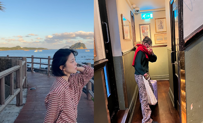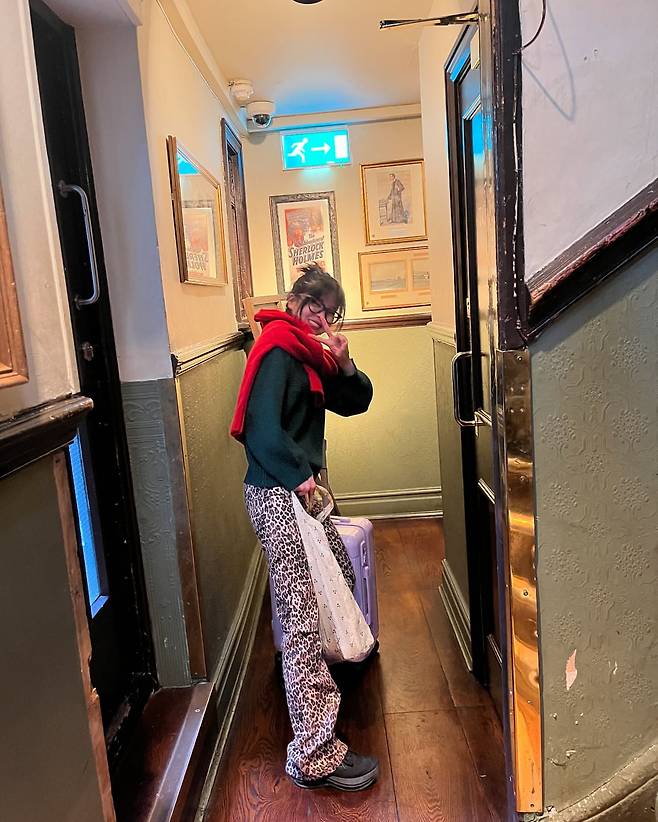 두 번째 사진에서는 짙은 초록색 니트와 빨간 스웨터를 어깨에 걸쳐 레이어드한 스타일을 선보였다. 여기에 레오파드 팬츠와 편안한 블랙 슈즈를 더해 실용적이면서도 개성이 드러나는 여행자 룩을 완성했다. 손에 든 퍼플 캐리어와 에코백은 실용성과 스타일을 동시에 잡은 선택이다.