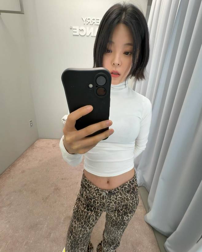 헤이니는 몸에 딱 맞는 화이트 크롭 톱과 레오파드 패턴 팬츠를 매치해 세련된 캐주얼 룩을 연출했다. 상의는 깔끔한 디자인으로 허리 라인을 강조하며, 하의는 강렬한 패턴으로 포인트를 더했다. 전체적으로 심플하면서도 개성 있는 스타일링이 돋보인다