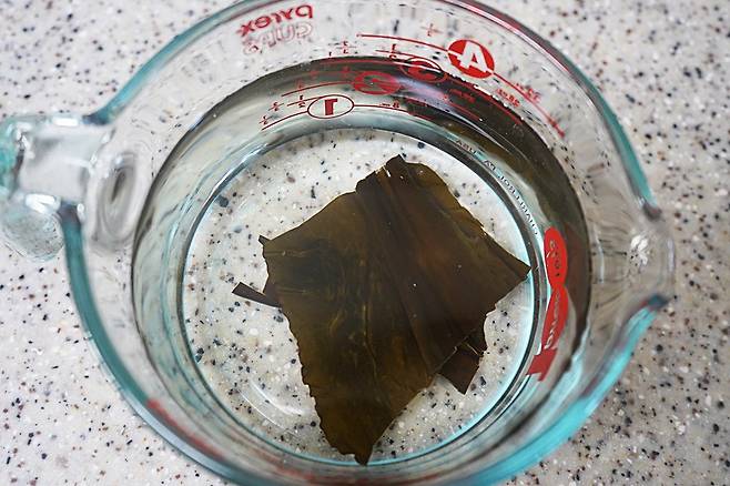 미지근한 물 1리터에 다시마 조각 5g을 넣어 10분 동안 우려냅니다.