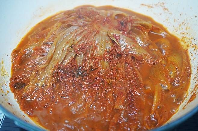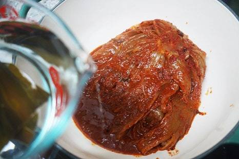 다시마 육수를 김치 옆으로 조심히 부어, 김치가 살짝 잠길 정도로 채웁니다.