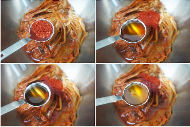 준비된 김치 위에 참치액 1스푼, 매실액 1스푼, 고춧가루 1/2스푼을 뿌리고, 들기름 2스푼을 듬뿍 넣어주세요~