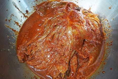 양념이 골고루 배도록 김치를 조물조물 무친 뒤 20분 동안 숙성합니다.