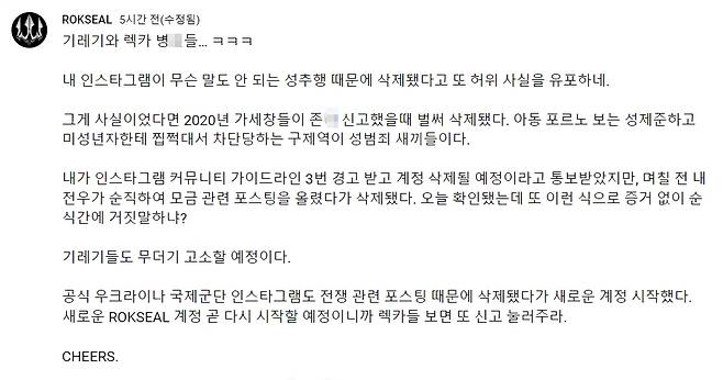또 "기레기들도 무더기 고소할 예정이다"라며 "공식 우크라이나 국제군단 인스타그램도 전쟁 관련 포스팅 때문에 삭제됐다가 새로운 계정 시작했다. 새로운 ROKSEAL 계정 곧 다시 시작할 예정이니까 렉카들 보면 또 신고 눌러주라"라고 설명했다.