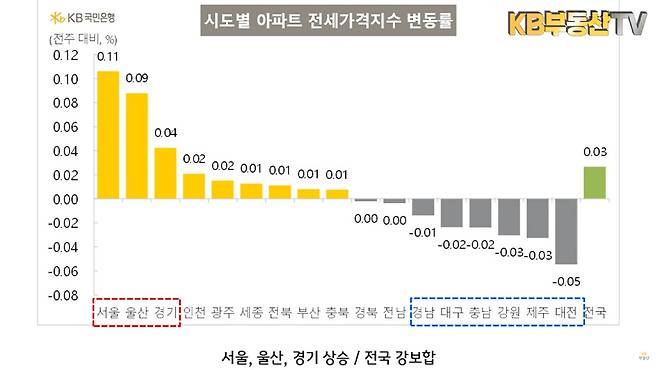 전국 아파트 전세가격은 0.03% 상승했으며, 수도권은 안정적인 상승 흐름을 유지 중입니다. 서울·경기·울산은 전세가 상승세를 이끄는 반면, 경남·대구·충남 등은 여전히 하락세입니다.