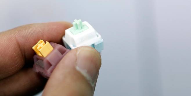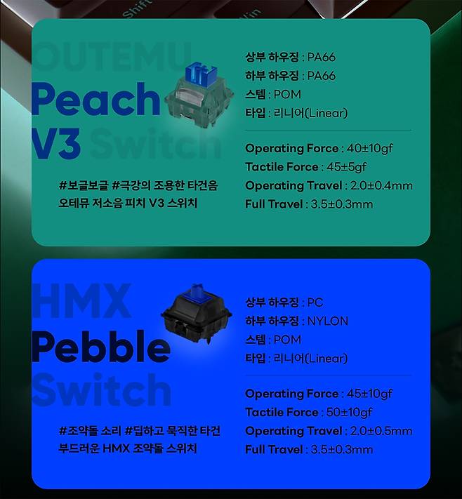 둘다 걸리는것 없는 리니어 타입이며 페브 스위치가 조금더 키압이 높습니다 . 테스트하고 있는 스위치는 피치축 제품으로 저소음에 초점을 맞춘 제품입니다.