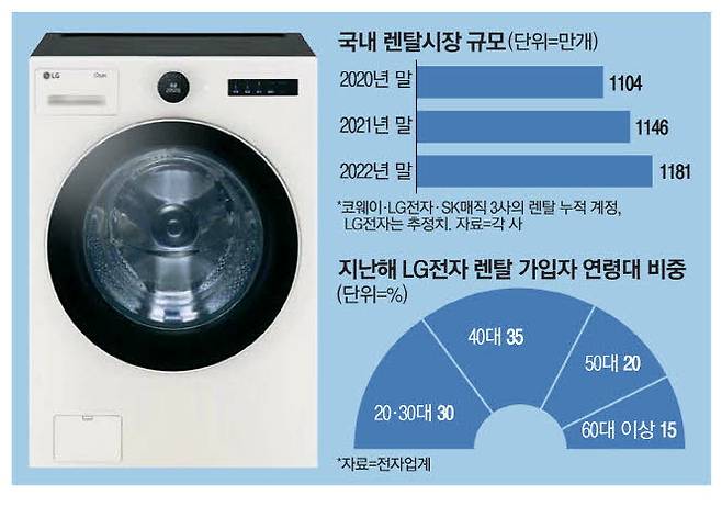 이 같은 가전 렌탈 시장 확대를 이끈 주인공은 단연 MZ세대다. 지난해 LG전자 신규 렌탈 가입자 가운데 20·30대 비중은 30%에 달하는 것으로 알려졌다. 40대까지 포함하면 20~40대 고객이 전체의 65%에 달한다.