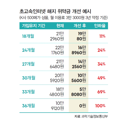 초고속인터넷은 대부분 3년(36개월) 약정으로 가입하도록 돼 있는데요. 해지 위약금은 약정기간의 3분의 2 시점인 24개월까지 계속 증가하다 이후 급격히 감소하는 구조예요. 그럼에도 약정만료 직전인 36개월 차에도 상당한 수준의 위약금이 발생해 이용자들에게 큰 부담이었어요. 과기정통부는 이러한 문제를 개선하기 위해 그동안 통신 4사와 위약금 개선안을 협의해왔어요. 그 결과 앞으로는 이용자의 가입유지 기간에 대한 기여분을 더욱 높이는 방식으로 위약금 구조를 고치기로 한 거예요. 예를 들어 3년 약정 시 월 이용료가 3만 3000원인 K사의 500메가 상품의 경우 24개월 차 위약금이 22만 2000원이던 것이 16만 9000원(24% 인하)으로, 30개월 차는 20만 6000원에서 10만 6000원(49% 인하)으로 줄어들어요. 또 이전까지는 36개월 차에 해지하더라도 10만 9000원을 위약금으로 내야 했는데 이제 약정 마지막 달엔 위약금이 ‘0’원! 즉 위약금을 내지 않고 해지할 수 있게 됐답니다.