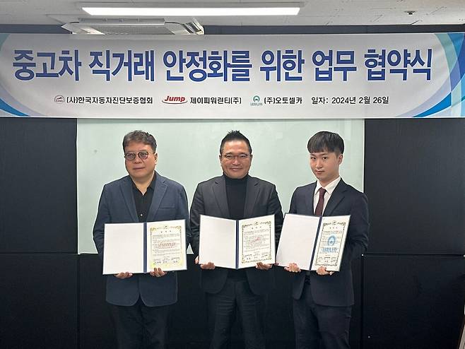 (사)한국자동차진단보증협회(회장 정욱)는 26일 서울 역삼동 협회 회의실에서 ㈜오토셀카(대표이사 엄찬호), 제이피워런티㈜(대표이사 박한용)와 개인간 중고차 직거래(C2C)에 자동차 성능·상태 점검 및 보증연장서비스(점프워런티)를 제공하기 위한 업무협약을 체결했다.