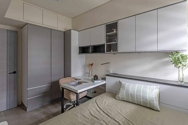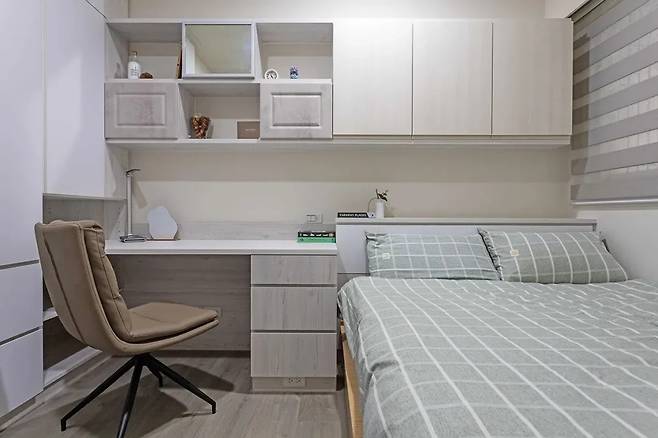 천장에 있는 낮은 보를 피해 맞춤형 책상과 수납이 계획되었으며, 책상이 침대 옆에 자연스럽게 연결되어 동선의 낭비 없이 구성되었습니다.