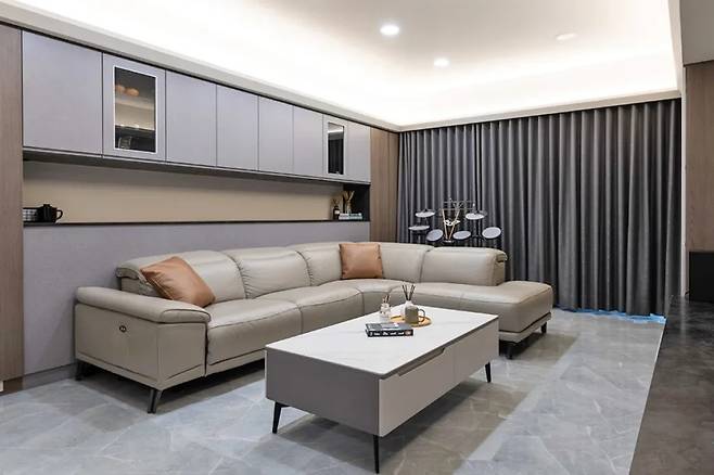 넓은 거실 공간은 수납장과 TV 벽체가 동일한 색상과 소재로 정리되어 안정감을 줍니다. 벽면은 부드러운 회색으로 칠하고 패브릭 질감의 소재로 마감하여 온화한 분위기를 자아냅니다.