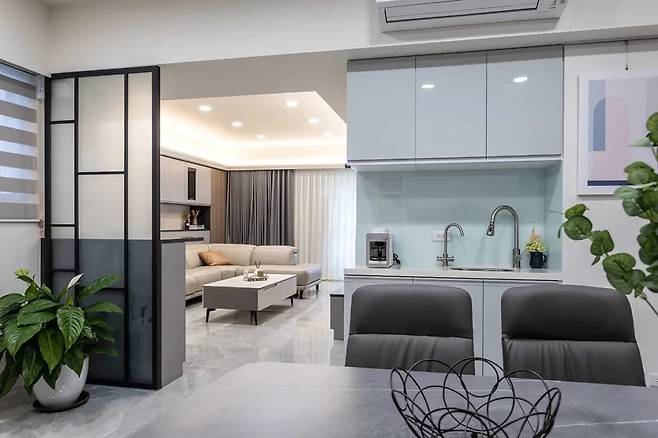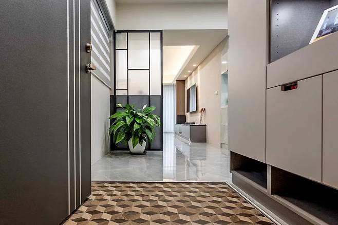 대부분의 여성들이 선호하는 꽃무늬 타일 대신, 정제된 기하학적 패턴을 선택한 점이 눈에 띕니다. 자연광이 풍부하게 들어오는 구조 속에 일체형 신발장이 자리 잡고 있으며, 철제 스크린은 바 형태의 간이 조리대와 소통 공간으로 변신했습니다.