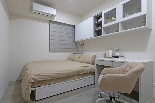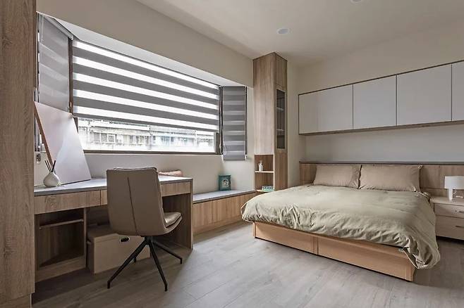 안방은 남편을 위한 책상과 아내를 위한 창가 벤치를 심플하게 나눠 균형을 맞춘 구조가 특징입니다. 양쪽 벽면에는 각각 다른 수납장이 놓여 있으며, 개폐 방식과 디자인이 달라 부부의 개성을 잘 반영했습니다.