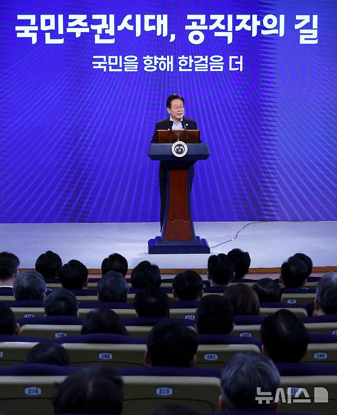 [서울=뉴시스] 최동준 기자 = 이재명 대통령이 31일 서울 종로구 정부서울청사에서 열린 '국민주권시대 공직자의 길' 고위공직자 워크숍에서 특강하고 있다. (대통령실통신사진기자단) 2025.07.31. photocdj@newsis.com