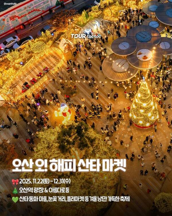 산타 동화 마을을 콘셉트로 조성된 오산 오! 해피 산타 마켓은 산타 포토존, 지역 작가 플리마켓, 먹거리 부스 등이 어우러진 복합 문화 행사로 구성됩니다. 가족과 연인 모두에게 추천할만한 크리스마스 마켓입니다.