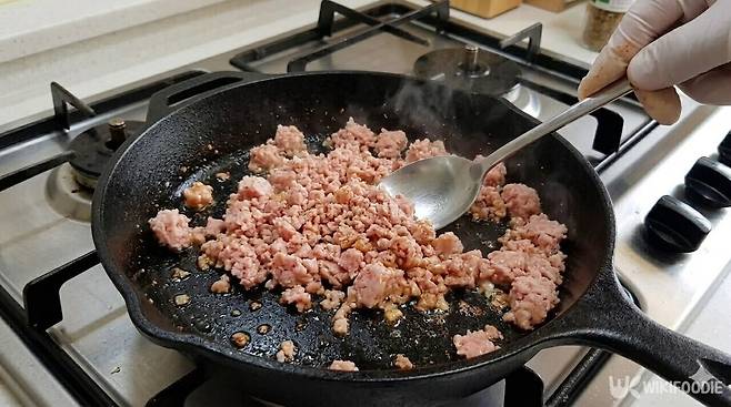 가장 먼저 통조림에서 꺼낸 스팸 겉면의 미끌거리는 기름기를 키친타월로 깨끗하게 닦아낸다. 이 과정을 거쳐야 볶았을 때 잡내가 없고 맛이 깔끔해진다. 뽀송뽀송해진 스팸은 넓은 그릇에 담아 손으로 힘을 주어 완전히 으깬다. 덩어리가 남지 않도록 세밀하게 으깨야 나중에 양념이 낱알마다 골고루 배어들어 깊은 맛을 낸다.