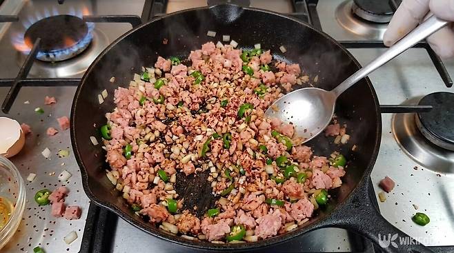 스팸에서 기름이 충분히 나오면 팬 가운데에 동그란 공간을 만든 뒤 다진 양파를 넣는다. 양파를 곧장 섞지 않고 잠시 기다리면 수증기가 올라오며 수분이 증발하는데, 이때부터 스팸과 섞어가며 본격적으로 볶는다. 수분을 충분히 날려주는 것이 이번 요리의 비결이다. 고슬고슬한 볶음밥 같은 느낌이 들 때까지 바닥이 타지 않게 잘 긁어가며 볶아준다.