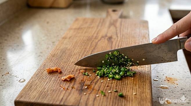 마지막으로 썰어둔 대파 흰 부분과 청양고추를 모두 넣는다. 대파와 고추는 오래 볶으면 향이 사라지고 색이 변하므로 1분 내외로 짧게 볶은 뒤 즉시 불을 끈다.