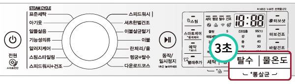 [통살균] 표시와 연결된 탈수 + 물온도 버튼을 3초간 누르세요.