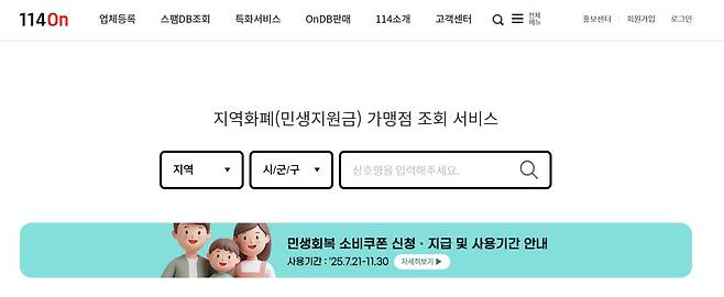 114 공식 홈페이지 '114On'에서 지역별·업종별 검색 기능을 통해 소비쿠폰 가맹점과 매장 위치를 손쉽게 조회할 수 있습니다.
