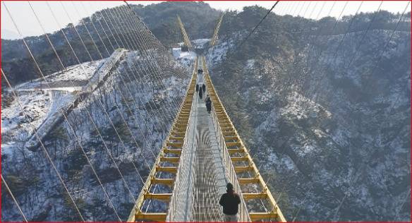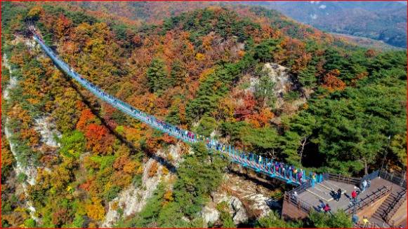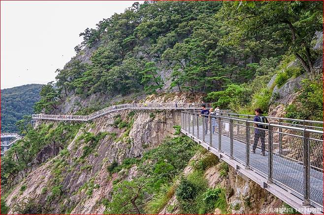 해발 200m 절벽을 따라 설치된 360m의 잔도길과 삼산천을 조망할 수 있는 스카이타워는 보기만 해도 손에 땀을 쥐게 합니다.