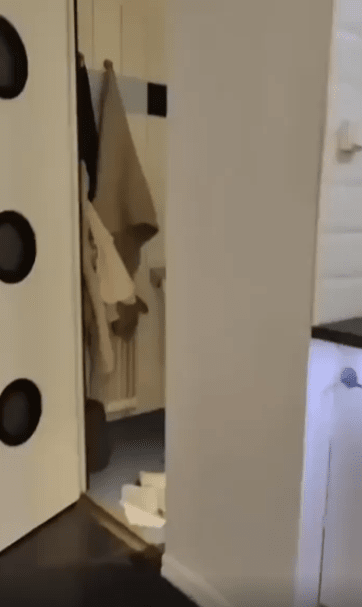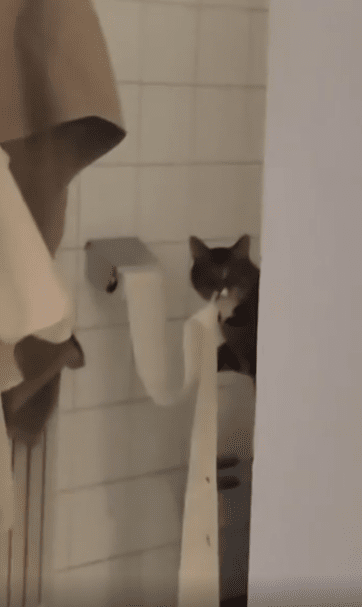 좁은 화장실 한켠, 바닥을 따라 두루마리 화장지가 길게 풀려 있습니다. 누가 봐도 장난의 흔적이 역력한 상황. 그리고 그 끝에는 변기 위에 조용히 올라앉은 고양이 한 마리가 있습니다.