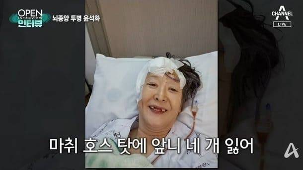 윤석화는 수술 후 20시간이 넘는 마취로 인해 앞니 4개가 빠졌습니다. 그는 "(수술 후) 처음에는 방사선, 표적 항암 치료를 했다. 그땐 내가 너무 힘들었다. 몸무게가 43kg였는데 7kg가 빠졌었다. 주치의 선생님은 단순 병을 보신 게 아니라 제 삶을 이해해 주셨다. 제가 자연치료법으로 한다고 했을 때 이해해 주셨다"고 설명했습니다.