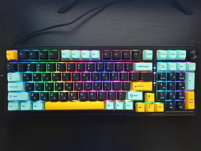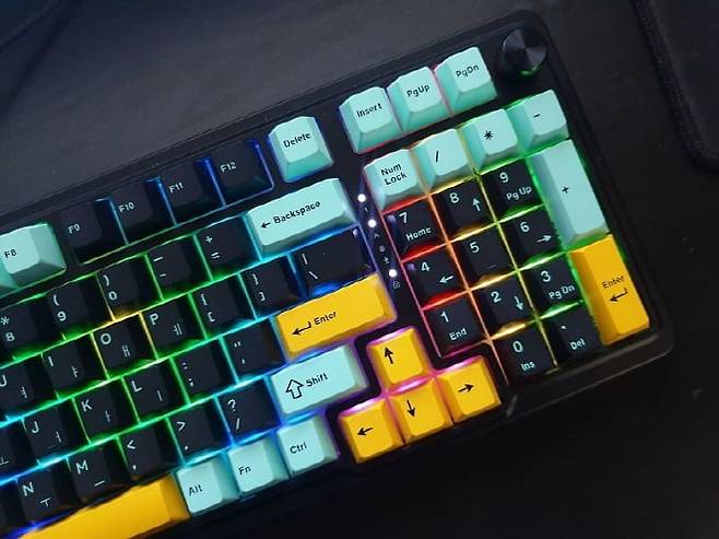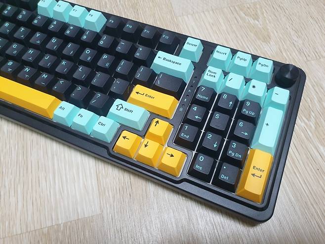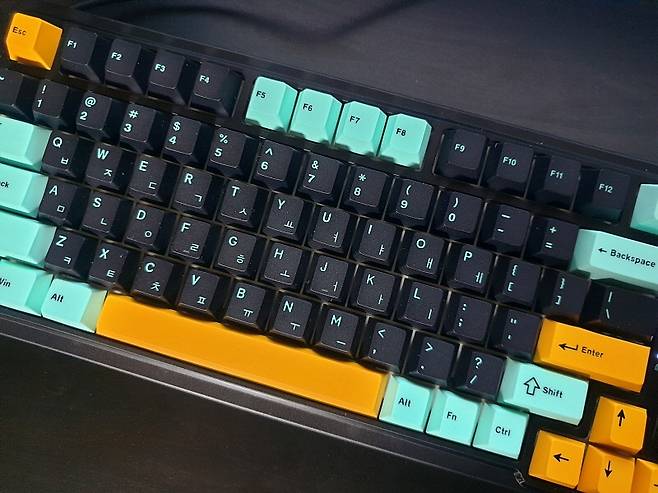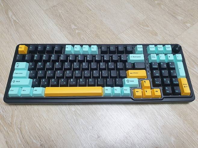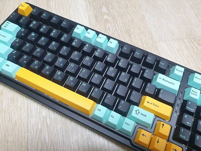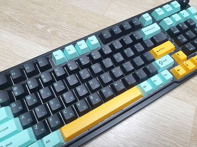 숫자 패드 포함한 98키의 컴팩트한 크기에 깔끔한 3가지 색상의 키캡이 장착되어 있습니다.