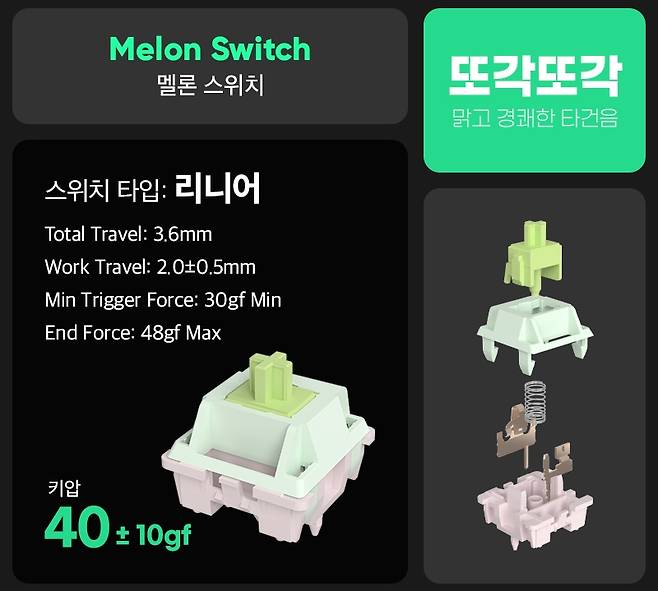 앱코 자체 개발한 오테뮤 멜론 스위치(리니어)가 장착되어 있어 맑고 경쾌한 타건음을 제공하