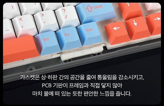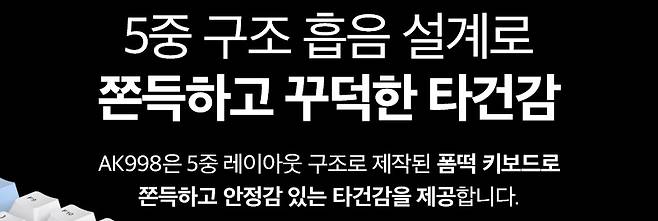 - 5중 레이어 장착의 흡음 설계 및 가스켓 장착으로 타건감과 통울림 최소화