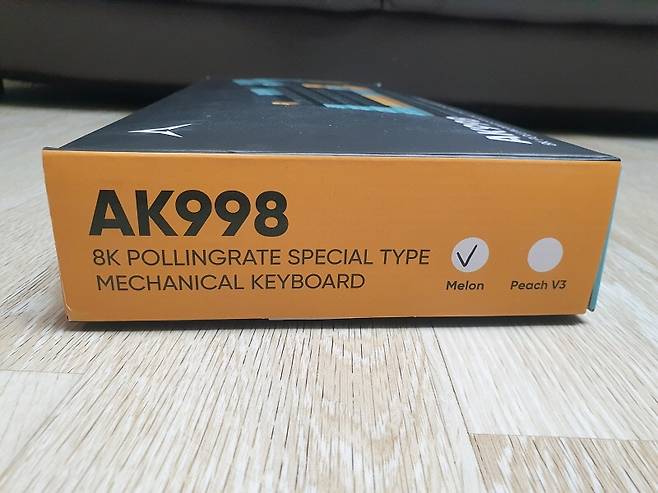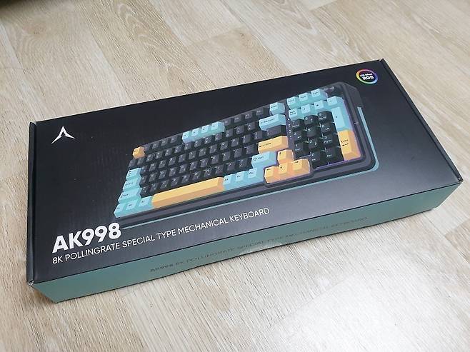 정면에는 AK988 8K 폴링레이트 제품명, 제품 사진, RGB LED 지원 표기가 있습니다.