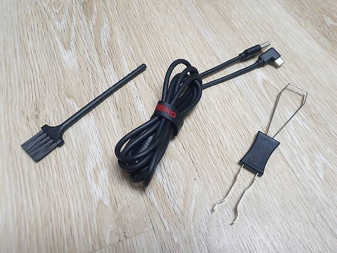 착탈식 USB-C 타입 케이블로 C 부분은 기역자 형태이고, 노이즈 필터와 케이블 타이가 있습니다.
