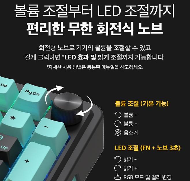 - 다이얼 노브 장착으로 볼륨 업/다운(음소거), 다양한 RGB LED 모드(속도, 밝기) 설정