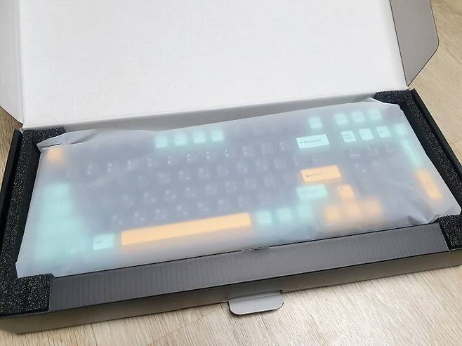 개봉해 보니 비닐 포장된 키보드가 완충재에 잘 고정되어 있습니다.