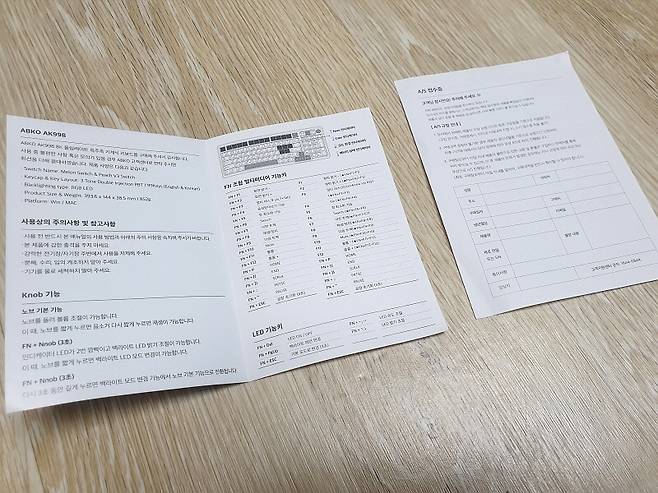 구성품은 키보드, 메뉴얼 1부, A/S 접수증 1부, C 타입 케이블(착탈식), 청소용 브러쉬, 키캡 및