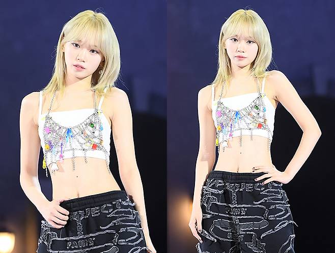 또, 김채원은 독특한 디자인의 검은색 조거 팬츠를 착용해 패셔너블한 그런지룩을 완성했습니다.