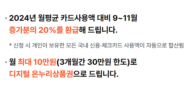 환급은 2024년 카드 사용액의 월평균 대비 2025년 9~11월 월별 사용 증가분의 20%를 기준으로 합니다. 예를 들어 2024년 월평균 카드 사용액이 100만 원이고, 2025년 10월 카드 사용액이 150만 원이라면 증가액 50만 원의 20%인 10만 원을 환급받을 수 있습니다. 다만 월별 최대 환급액은 10만 원, 총 30만 원을 넘지 않습니다.