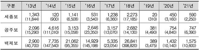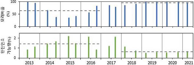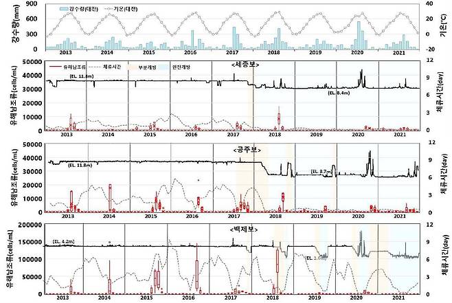 | ▲ <금강 수계 보 구간 유해남조류세포수 추이(2013년 ~ 2021년)> 4대강 보 개방 모니터링 종합분석 보고서(2017년 6월 ~ 2021년 12월), |