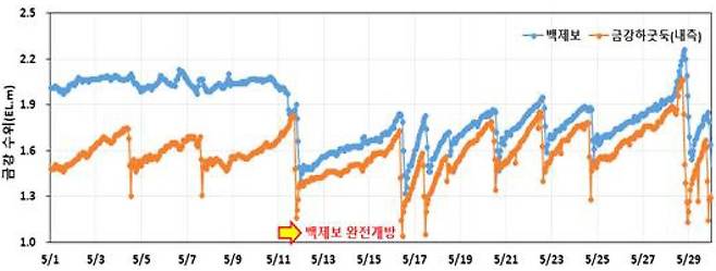 | ▲ <2021년 5월 백제보 및 금강하굿둑 수위 변화> 4대강 보 개방 모니터링 종합분석 보고서(2017년 6월 ~ 2021년 12월) |