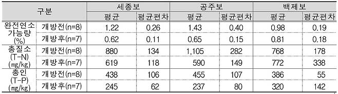 | ▲ <금강 수계 보별 퇴적물 내 유기물ㆍ영양물질 함량> ※ 개방전 2013년 ∼ 2016년 평균 / 개방후 2018년 ∼ 2021년(상반기) 평균, 연 2회(3∼6월, 9∼11월)측정, 4대강 보 개방 모니터링 종합분석 보고서(2017년 6월 ~ 2021년 12월), |