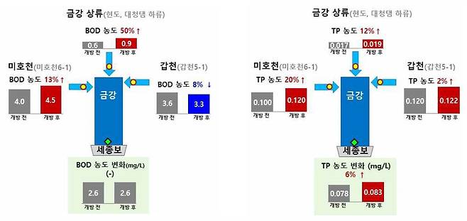 | ▲ <보 개방 전(2013년 ∼ 2016년)·후(2018년 ∼ 2021년) 평균 BOD·T-P 수질 변화> ※ 세종보 유량 77.8 ㎥/s(2013년 ∼2021년 평균) 중 갑천, 미호천이 차지하는 비율 각 21%, 44% (갑천 : 16.3 ㎥/s, 미호천 34.0 ㎥/s), 4대강 보 개방 모니터링 종합분석 보고서(2017년 6월 ~ 2021년 12월), |