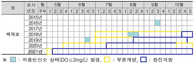 | ▲ <금강 백제보 저층빈산소 발생 현황> 4대강 보 개방 모니터링 종합분석 보고서(’17.6 ~ ’21.12), |
