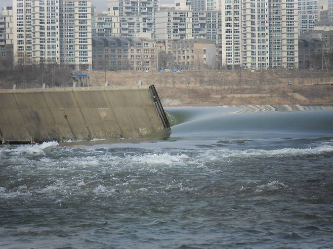 | ▲ 부실한 세종보 고장 세종보 가동보 일부가 수압을 견디지 못하고 연결 접합부위가 뜯겨져 나갔다.(2013년 2월 28일) |