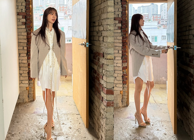 사진 속 윤은혜는 화이트 셔츠형 원피스에 오버핏 그레이 재킷을 매치해 모던하면서도 우아한 분위기를 연출했다.