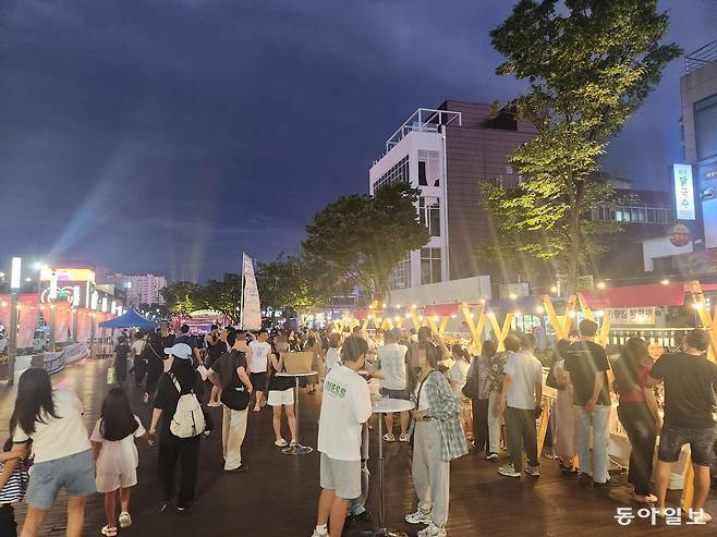 ‘강릉시민이 만드는 월화거리의 밤’을 주제로 한 월화거리 야시장은 특색 있는 먹거리와 체험형 프리마켓, 공연 등 다양한 볼거리를 갖췄다. 감자명란마요, 삼겹살치즈말이, 타코 등 식품 매대 22개, 캐리커처와 송이버섯 커피 등 체험형 프리마켓 25개 등 총 47개 부스가 설치돼 있다. 이 가운데 청년 운영자가 33명으로, 예전에 비해 젊은 감성과 개성 있는 메뉴가 많아졌다는 평가가 나온다.