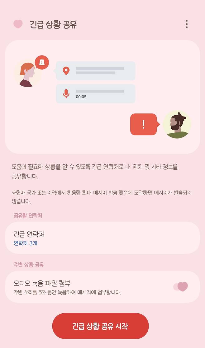 오디오파일 녹음 메뉴를 켜두면 긴급 상황 공유가 시작되자마자 5초간 주변 소리가 녹음돼서 공유돼