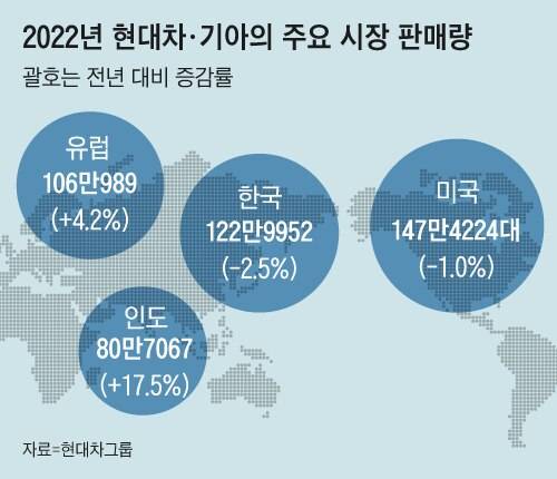 현대차그룹은 주요 경쟁사들의 판매가 큰 폭으로 감소한 와중에도 글로벌 판매를 전년 대비 2.7% 늘렸다. 우크라이나 침공 여파로 러시아 판매가 급감했지만 미국과 유럽에서 10% 수준의 점유율을 달성하며 이를 만회한 덕분이다. 2021년 미국 시장에서 혼다를 제친 현대차그룹은 지난해 미국 판매량 147만대로 처음으로 10%가 넘는 점유율(10.8%)을 기록하며 GM·도요타·포드·스텔란티스에 이어 5위를 굳히고 있다. 유럽에선 2021년 8.7%이던 점유율이 지난해 9.4%로 높아졌다. 폴크스바겐·스텔란티스·르노 다음 4위로, 르노와의 판매 격차는 571대에 불과했다. 브랜드 파워가 강력한 현지 브랜드들 사이에서 인지도를 높이고 있는 것이다.