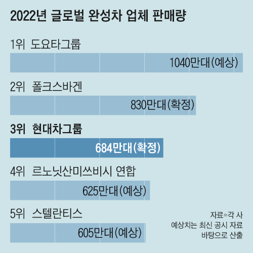글로벌 1, 2위는 2021년보다 1% 감소한 1040만대(예상치)를 판매한 도요타그룹, 7% 감소한 830만대를 판 폴크스바겐그룹이 각각 차지했다. 현대차그룹과 3위를 다툰 르노닛산미쓰비시 연합은 현대차에 50만대가 못 미친 총 625만대를 판매한 것으로 추산된다. 르노는 전년 대비 5.9% 감소한 205만대, 닛산·미쓰비씨는 각각 320만대·100만대를 판 것으로 예상된다. 이 같은 판매량은 각 사의 가장 최근 실적 발표를 토대로 산출한 것으로, 일부 오차가 있을 수 있지만 순위가 바뀔 가능성은 크지 않다. 5위인 스텔란티스(푸조시트로엥과 피아트크라이슬러 합병)는 지난해 미국·유럽 판매가 10% 넘게 하락해 약 605만대를 판매하는 데 그친 것으로 추산됐다.
