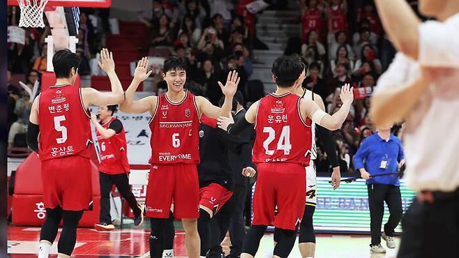 정관장 선수들이 4쿼터 작전타임 때 벤치로 들어가며 기뻐하고 있다.