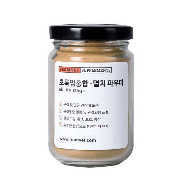 관절염이나 슬개골탈구 등으로 관절이 안 좋은 강아지라면, 초록입홍합&멸치 파우더도 추천해요. 마찬가지로 퍼푸치노나 다른 간식, 사료 위에 뿌려 급여해도 좋습니다.